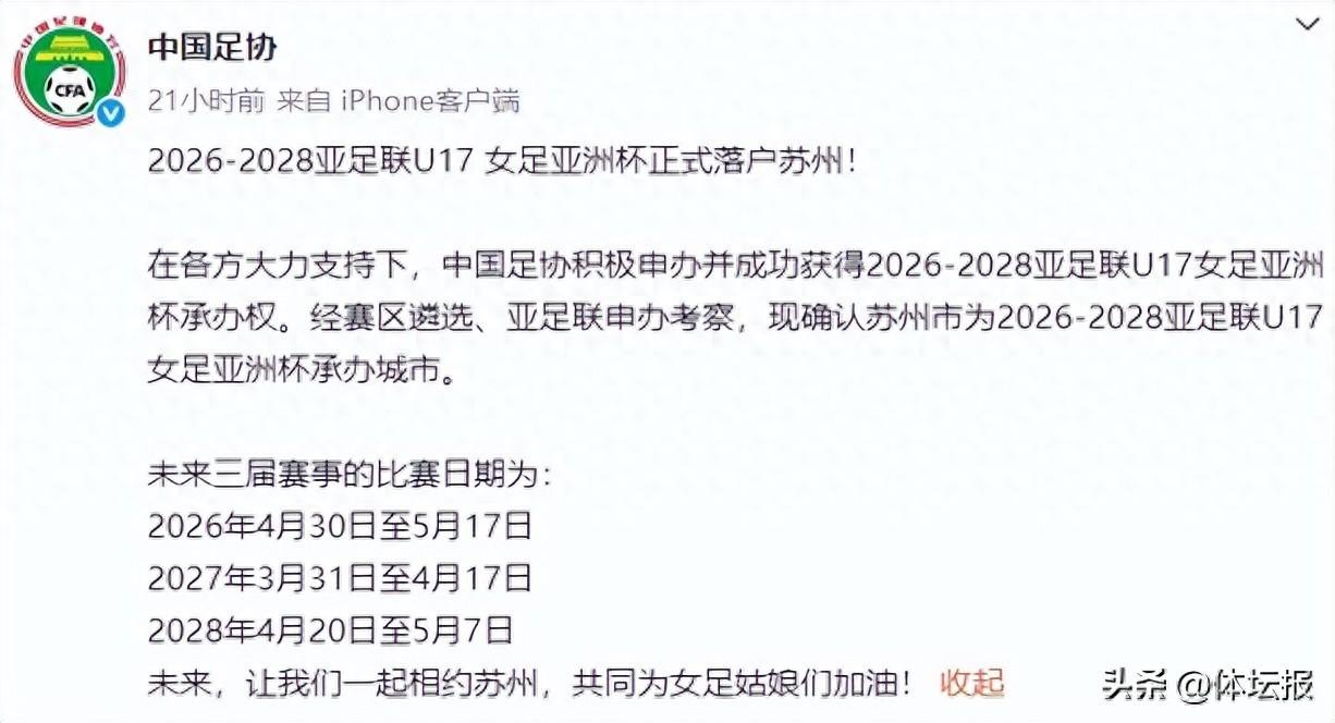北京時間4月22日,中國足協發佈公告,宣佈2026-2028亞足聯U17女足亞洲盃正式落戶蘇州。從2008年國際足聯創立U17女足世界盃以來,U17女足國少隊在此前8屆賽事裏僅3次入圍,明年開始連續3屆U17女足亞洲盃在中國舉辦,中國U17女足有東道主之利,衝擊U17女足世界盃的可能性大增。
