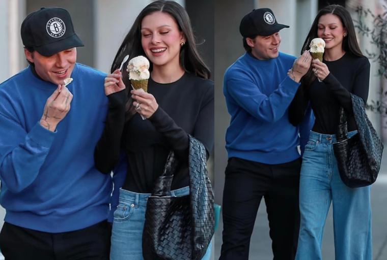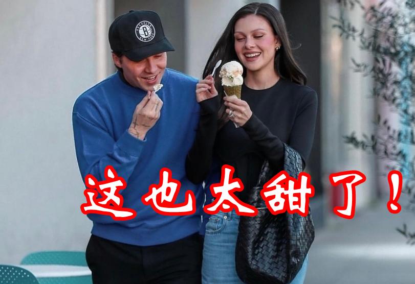 這次出街,妮可拉穿着就要簡單很多了, 一條寬鬆牛仔褲,搭配一件黑色的緊身長袖,一頭柔順黑髮披肩,幾乎是素顏的妝容,更顯得有氣質,而身旁的丈夫布魯克林,戴了一頂有籃網隊徽的帽子,穿着藍色的衛衣,少年感十足。兩人同框喫着冰淇淋的樣子,確實太甜了,讓人不禁感嘆青春的美好。
