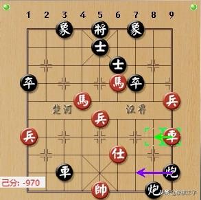 此際中盤第70手,黑只要輕盈一手炮3退8,回炮底線,下手炮3平4,攻守皆備,攻擊紅棋的六路三樓高帥,就幾乎勝定,大優上千分。