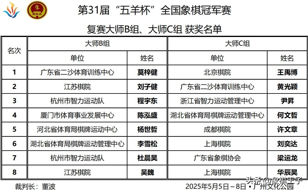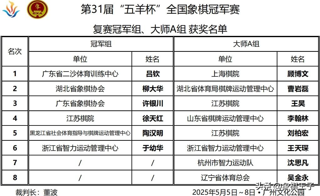 賽會複賽全部收兵,晉級八強全名單:冠軍組呂欽、柳大華,大師A組顧博文、曹巖磊,大師B組莫梓健、劉子健,大師C組王禹博、黃光穎。