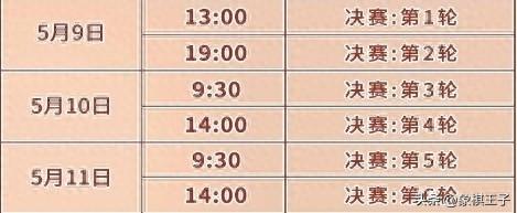 根據賽程,資格賽、複賽之後,決賽階段於5月9日至11日,9日下午一點、晚上七點,10日、11日,上午九點半、下午兩點,展開決賽階段的八強雙敗淘汰制,決出總冠軍,象棋王子持續直播。