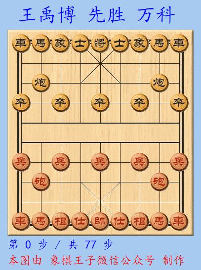紅棋優勢一路擴大,及至車馬炮雙兵仕相全對車馬炮卒士象全,王禹博目光敏銳,77手揮炮打士,一招強破黑方防線,當即制殺。