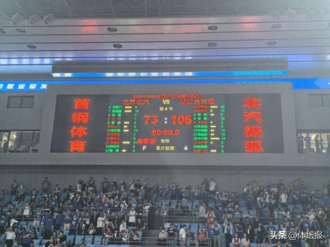 在傑曼手感全無的情況下,北京的進攻始終無法形成連續性。儘管頻繁嘗試外線出手,無奈主場的籃筐就是不給面子,場邊觀戰的曾凡博面色凝重,北京球迷也開始提前離場。終場前6分鐘,納托爾甚至出現了反擊一打零上籃打鐵的低級失誤,而兩隊分差已經來到32分,比賽徹底進入垃圾時間。