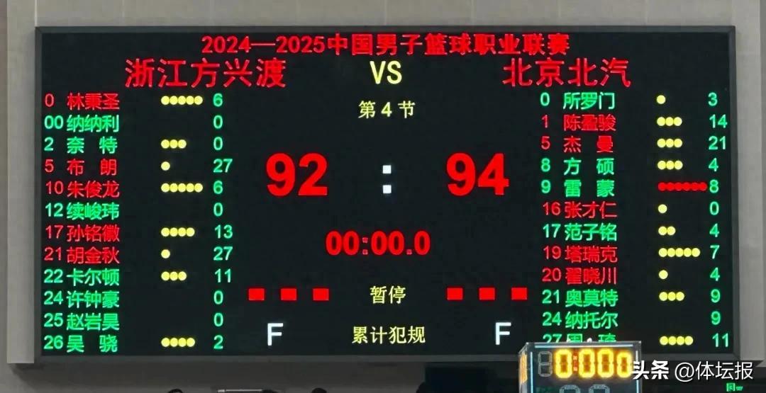終場前1分25秒,胡金秋弧頂三分打板命中,兩隊打成92平!全場球迷的熱情終於又一次被點燃!終場前25.3秒,孫銘徽造成犯規後兩罰不中,但出界後球權仍歸屬方興渡,孫銘徽立刻請求暫停。