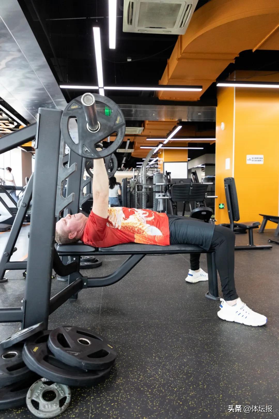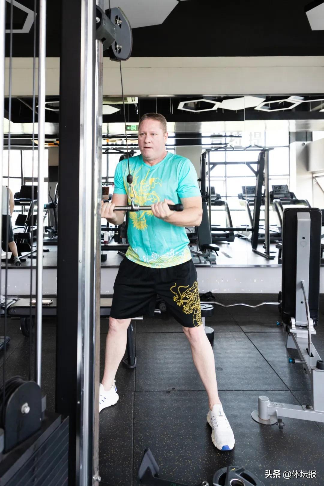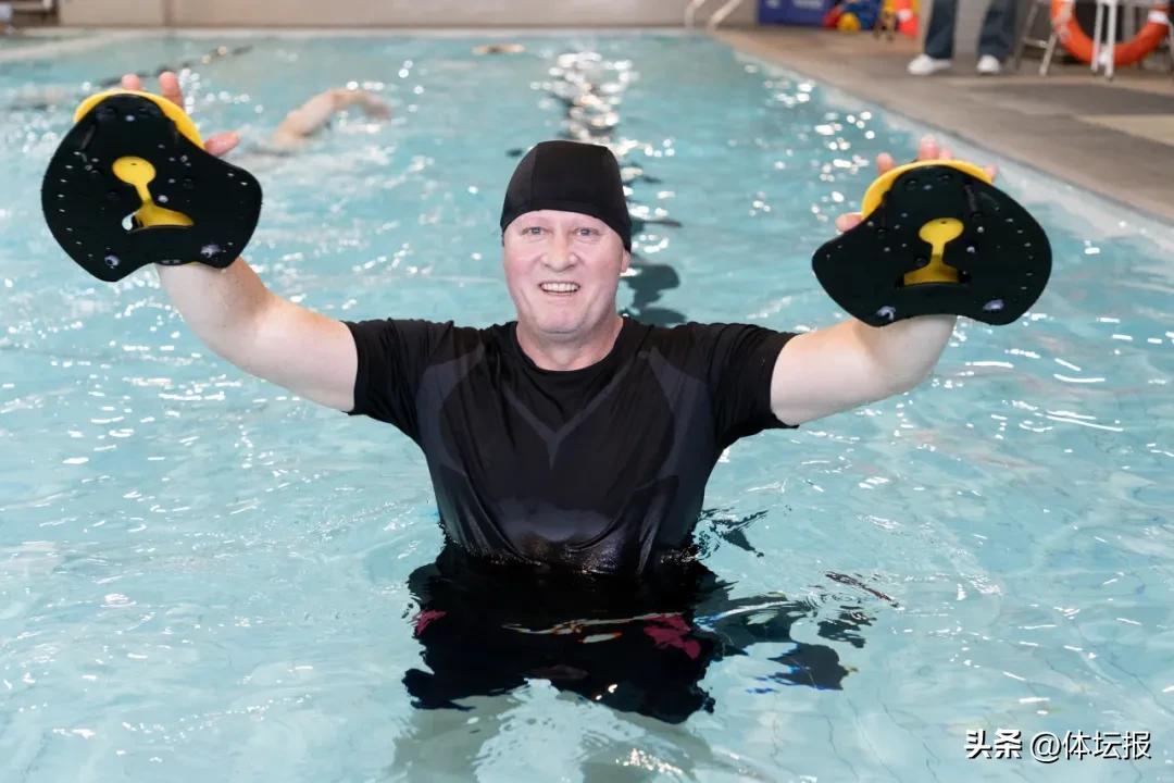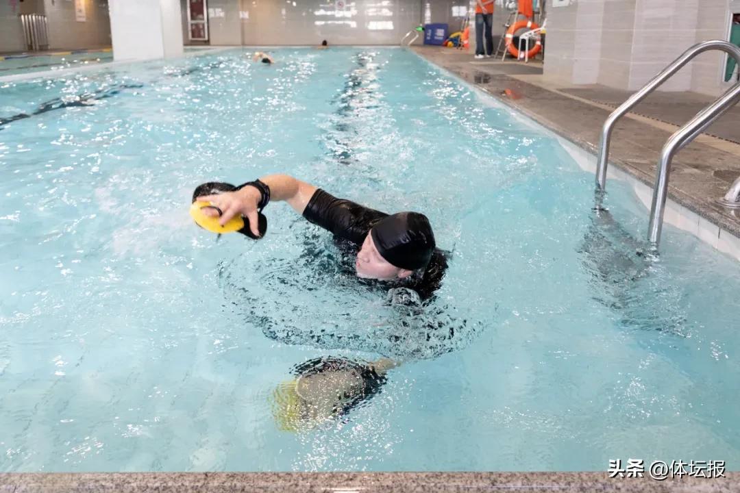 記者跟隨王偉走進健身房游泳池,在這裏還見識到了他自創的“阻力”訓練法——把兩塊手蹼拼成巨型划水板,在水裏復刻龍舟動作,增加肌肉耐力。