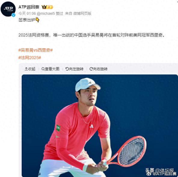 2025年法國網球公開賽正賽將於5月25日開打。賽事資格賽已於今日開打,根據籤表,浙江選手吳易昺將對陣西里奇。