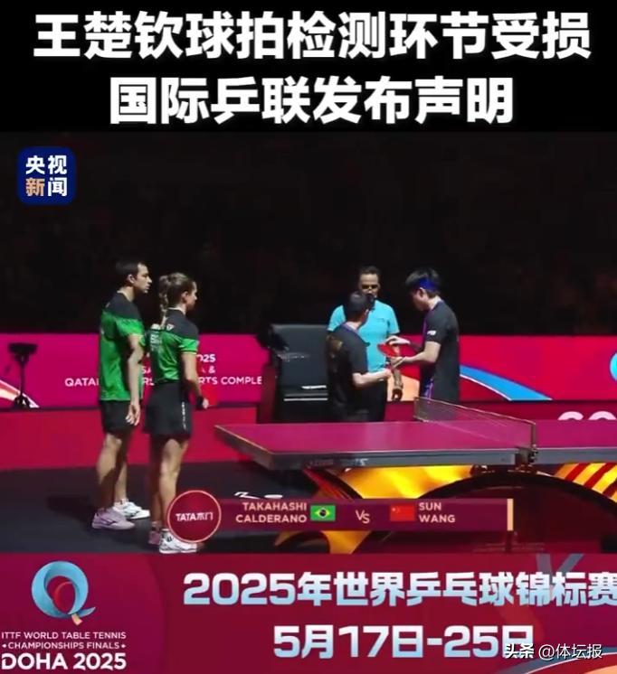 當地時間5月19日下午,在2025年國際乒聯多哈世界乒乓球錦標賽混雙1/16決賽中,中國選手王楚欽的球拍在賽前檢測環節出現受損情況。