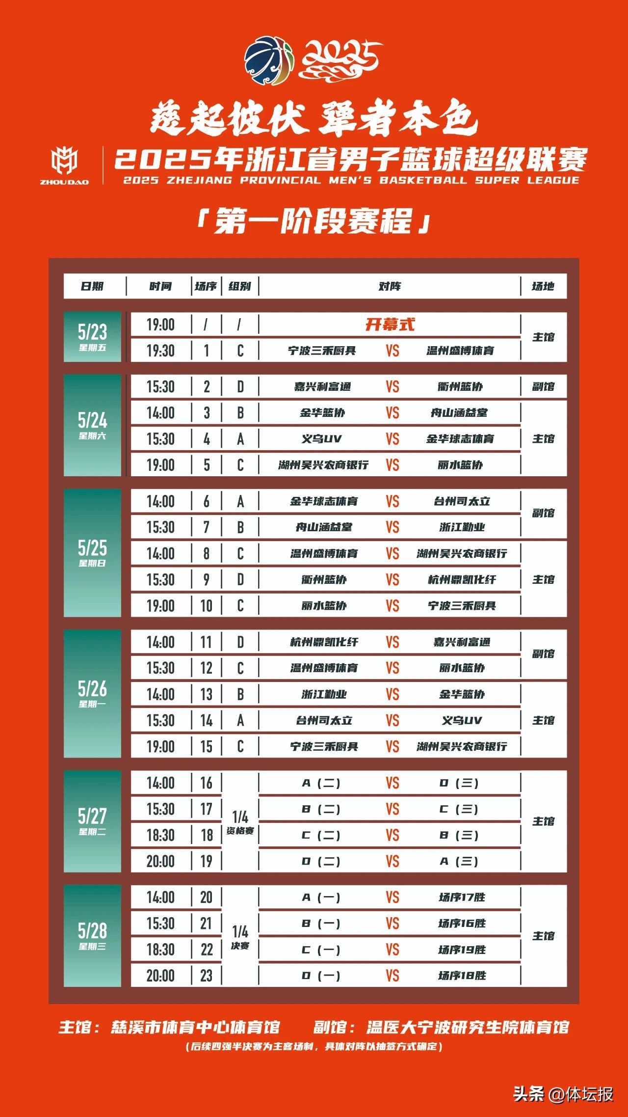 2025年浙超聯賽第一階段將於5月23日至28日在慈溪市體育館和溫醫大寧波研究生院體育館持續進行,13支精銳隊伍輪番獻技,展開精彩對決。