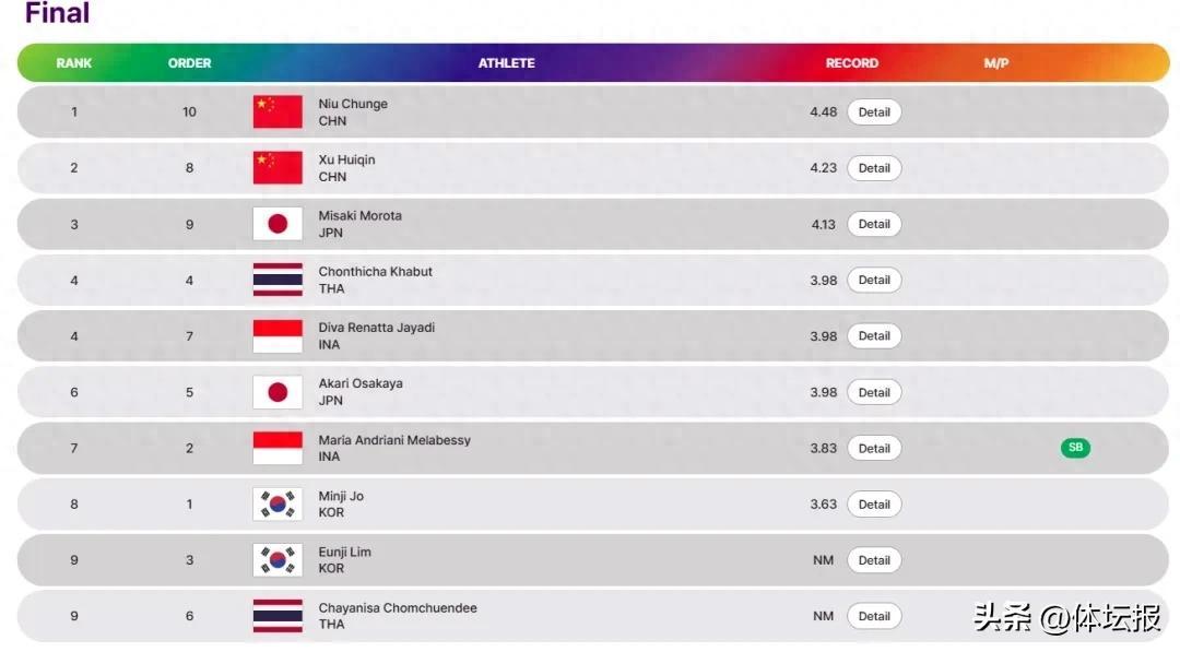 5月28日,亞洲田徑錦標賽繼續進行,在第二日的女子撐竿跳決賽中,中國隊包攬該項目的冠亞軍:安徽名將牛春格以4米48摘得冠軍,浙江名將徐惠琴以4米23獲得亞軍。
