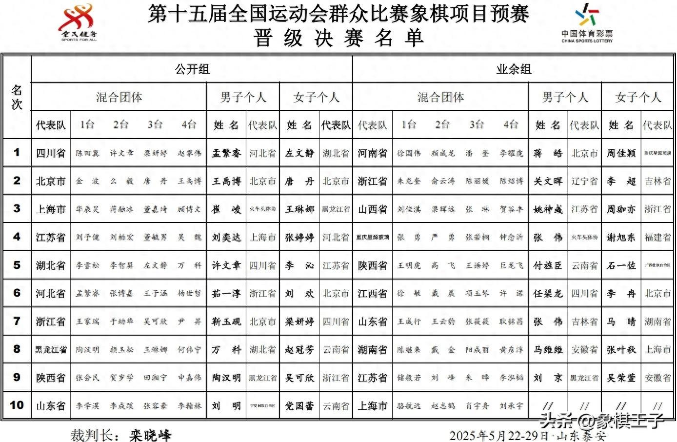 2025年第十五屆全運會象棋預賽的大戰,在本日全部收兵,所有的六項晉級決賽階段名單,悉數產生,134位男女戰將,二十六支隊伍,將雲集廣東,決鬥嶺南之巔。