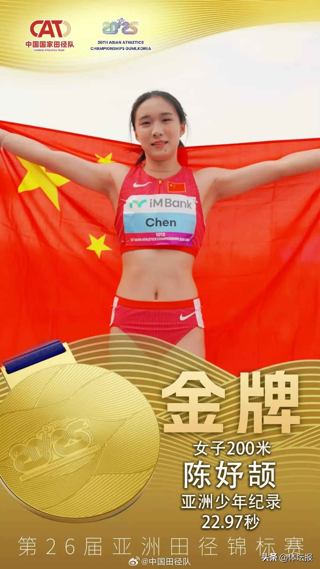 本次亞錦賽奪得2金的“小飛人”陳妤頡和奚梟橫、劉靜逸均在各自比賽中刷新了個人最好成績,特別是在昨日收官戰中,陳妤頡在200米決賽中以22秒97的個人最好成績爲中國隊貢獻寶貴金牌,再次刷新由她保持的亞洲少年紀錄。同時,時隔27年幫助中國隊重登該項目亞錦賽最高領獎臺,並直通9月舉行的田徑世錦賽。以劉靜逸爲代表的中生代也展現不錯實力,在女子七項全能決賽中,她以5869分奪得銀牌,時隔34年刷新了中國全能女將在該賽事上取得的最佳戰績。老將方面,32歲的徐惠琴在女子撐竿跳中收穫銀牌,爲國家隊征戰十年的她仍在書寫老將傳奇。