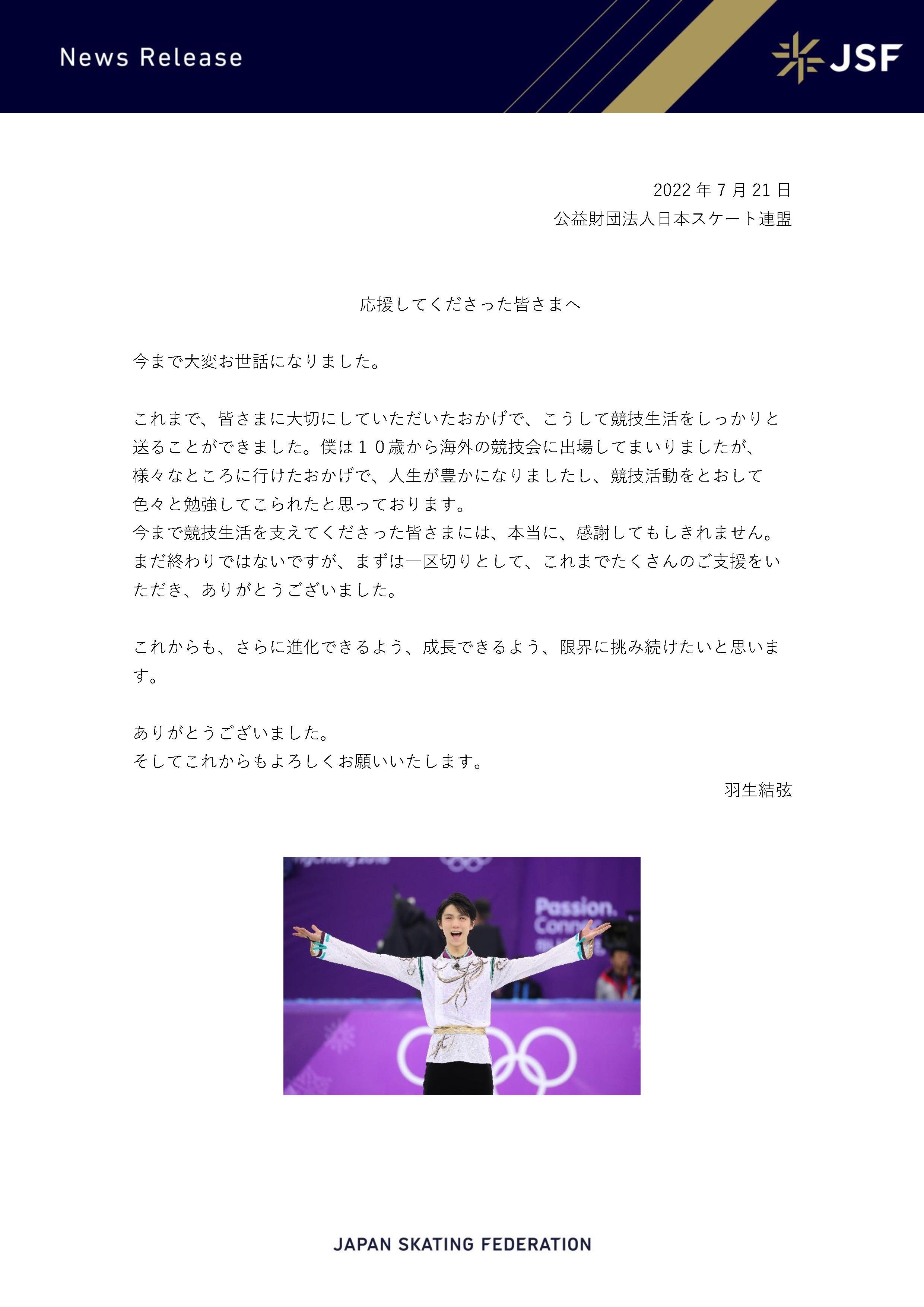 中新網北京7月21日電 21日,日本滑冰聯盟(JSF)發佈了羽生結弦給支持者們的感謝信。他坦言,非常感謝大家一直以來的支持與幫助,正因如此,他才能好好度過了競技生涯。