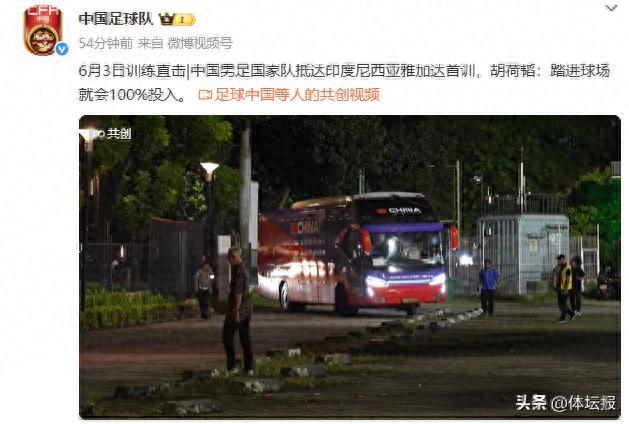 6月4日,中國足球隊官方發佈中國男足抵達印度尼西亞雅加達首訓視頻。