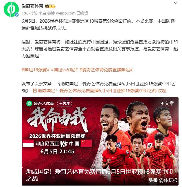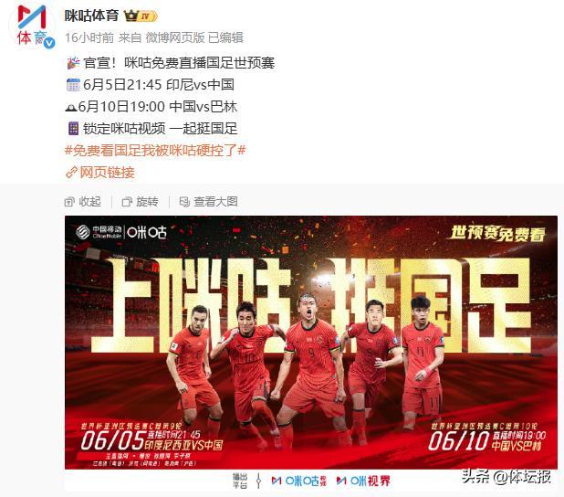 6月3日下午,愛奇藝、咪咕官方接連宣佈,將免費直播6月5日國足VS印尼。咪咕還宣佈將免費直播6月10日國足VS巴林。