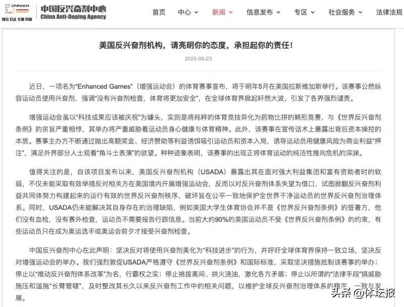5月23日晚,中國反興奮劑中心官網刊登標題爲《美國反興奮劑機構,請亮明你的態度,承擔起你的責任!》的頭條文章,強烈譴責“增強運動會”縱容運動員使用興奮劑的犯罪行爲。