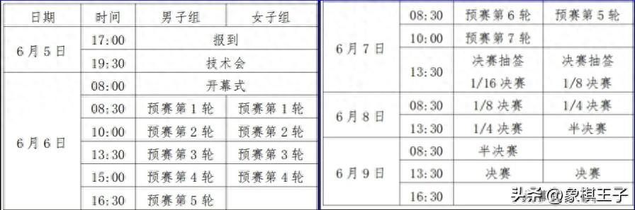 賽程6日上午八點半第1、2輪,下午一點半第3-5輪;7日上午八點半第6、7輪;7日下午一點半,32強戰;8日上午八點半、下午一點半,1/8決賽、1/4決賽;9日上午八點半、下午一點半,半決賽,冠軍總決賽,象棋王子全程直播。