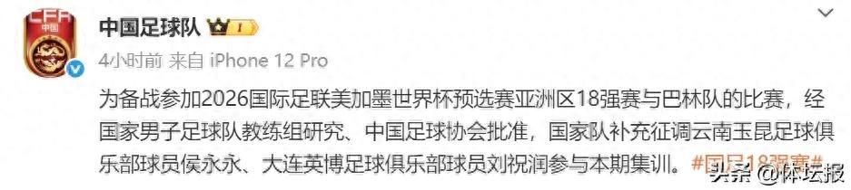 6月7日,中國男足宣佈補招兩位前場球員侯永永、劉祝潤入隊,以備戰世預賽18強賽末輪對陣巴林隊的比賽。