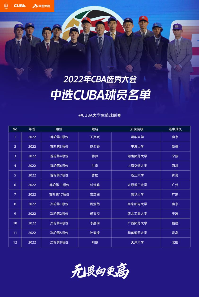 值得一提的是,在7月24日剛剛結束的2022CBA選秀大會中,有12位CUBA球員被職業俱樂部選中成爲職業球員!其中,來自清華大學的後衛王嵐嶔在首輪第一順位被南京同曦俱樂部選中,當選2022年CBA選秀大會狀元。來自寧波大學的範匯鎏則在首輪第三順位被新疆廣匯俱樂部選中,當選2022年CBA選秀大會探花。