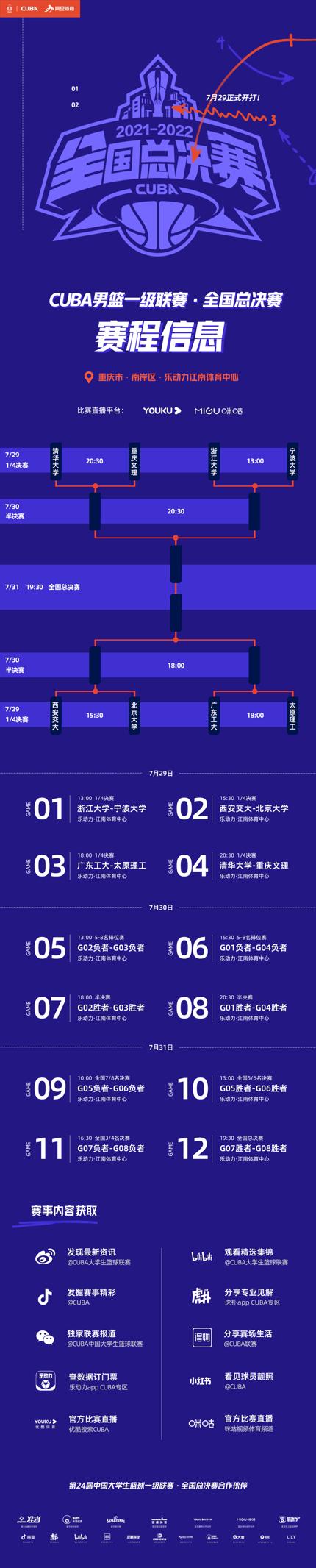 比賽將於7月29日,在重慶市南岸區的樂動力江南體育中心正式開打,直至7月31日決出本屆聯賽的全國總冠軍!這也是繼2021CUBA全明星之夜之後,CUBA第二次將比賽落在重慶南岸江南體育中心。南岸區火熱的籃球文化氛圍加持,爲賽事在當地的開展提供了人氣保障。