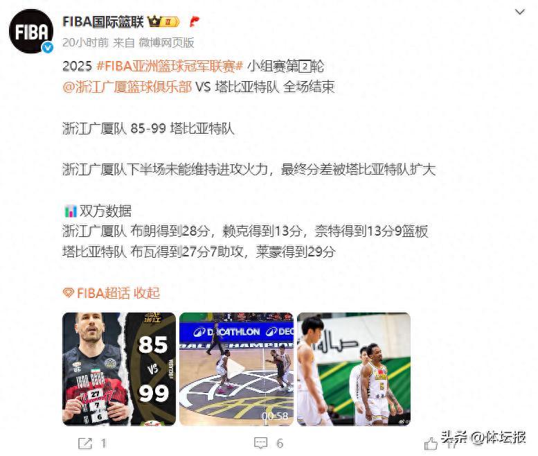 北京時間6月8日晚,FIBA亞洲籃球冠軍聯賽繼續展開小組賽階段爭奪。以新科CBA聯賽總冠軍身份出戰的浙江廣廈男籃,在攻防兩端均處劣勢,最終85:99不敵伊朗球隊塔比亞特。加上前一天以67:84負於蒙古球隊烏蘭巴托野馬,兩場小組賽打完,廣廈未嘗一勝,兩場共輸31分,位列小組第三。