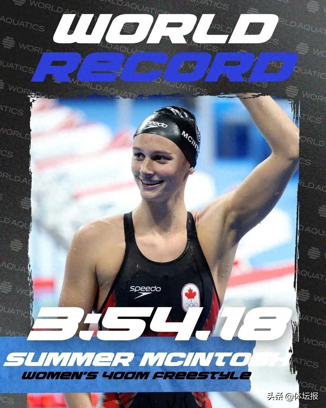 6月7日至12日,加拿大舉行新加坡世錦賽選拔賽,開賽僅三天就爆出大新聞:開賽首日,18歲小將薩默·麥金託什以3分54秒18的成績打破女子400米自由泳世界紀錄; 北京時間6月10日,她又在女子200米混合泳中游出2分05秒70,打破了匈牙利選手卡汀卡·霍蘇保持的世界紀錄(2分06秒12)。