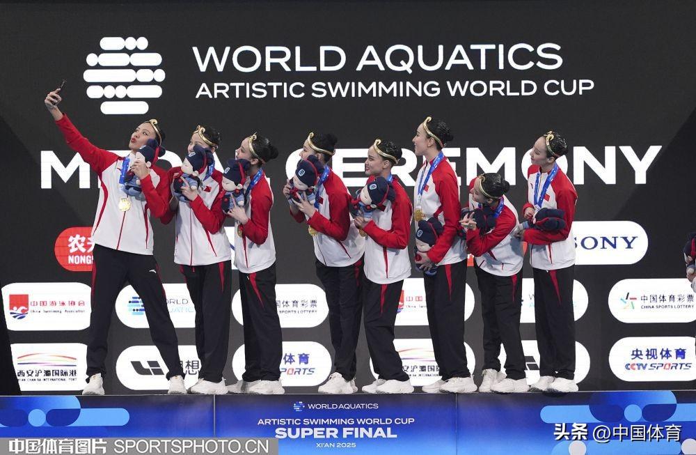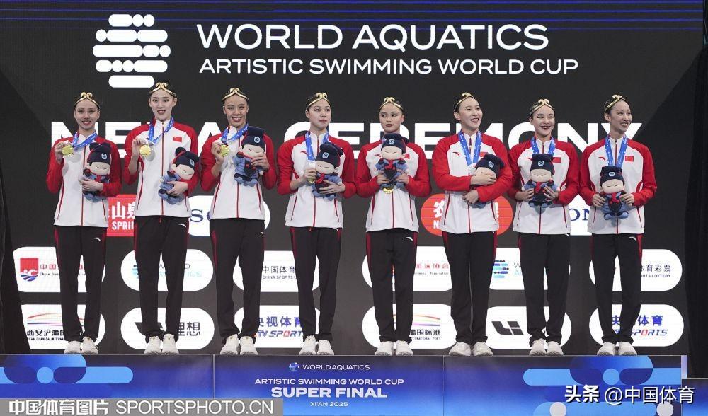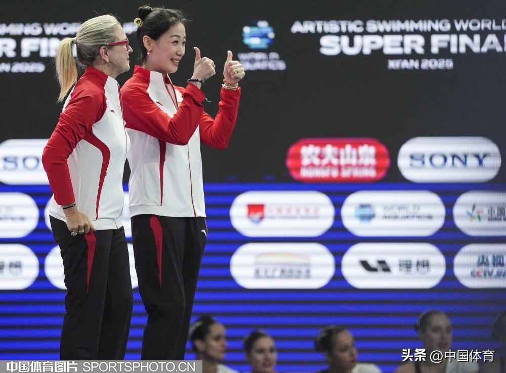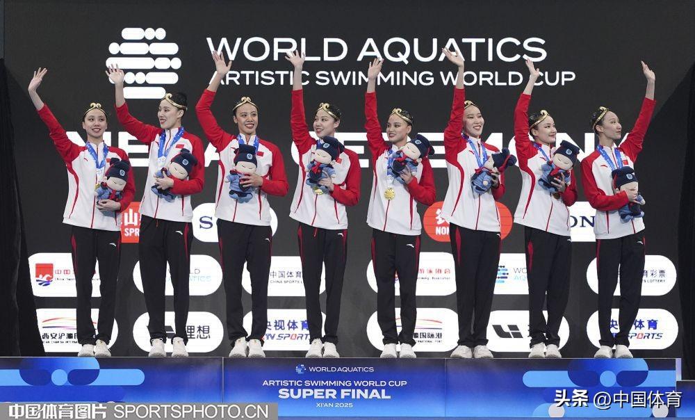 中國體育訊 6月13日,2025年世界泳聯花樣游泳世界盃總決賽在西安奧體中心遊泳跳水館舉行。在集體技術自選決賽中,由馮雨、常昊、林彥君、李岫宸、徐匯妍、巫競妍、向玢璇、戴詩意組成的中國隊以277.2258分的成績奪得冠軍。 這是當日中國隊繼女子單人技術自選和女子雙人技術自選後,收穫的第三枚金牌。(中國體育圖片 魏徵 攝)