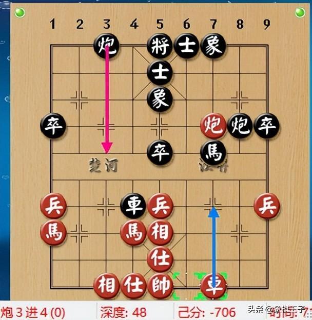 這步棋是超級大漏,董嘉琦目光敏銳,紅方車三進五,當的一手,砍掉黑方7路象尖馬。