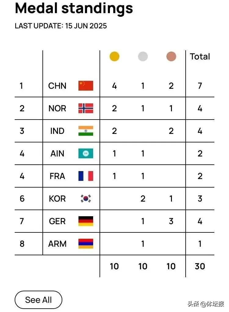 值得一提的是,本站賽事的10個項目比賽中,中國隊以4金1銀2銅的優異成績位列獎牌榜首位,其中,浙江選手貢獻了2金1銀。