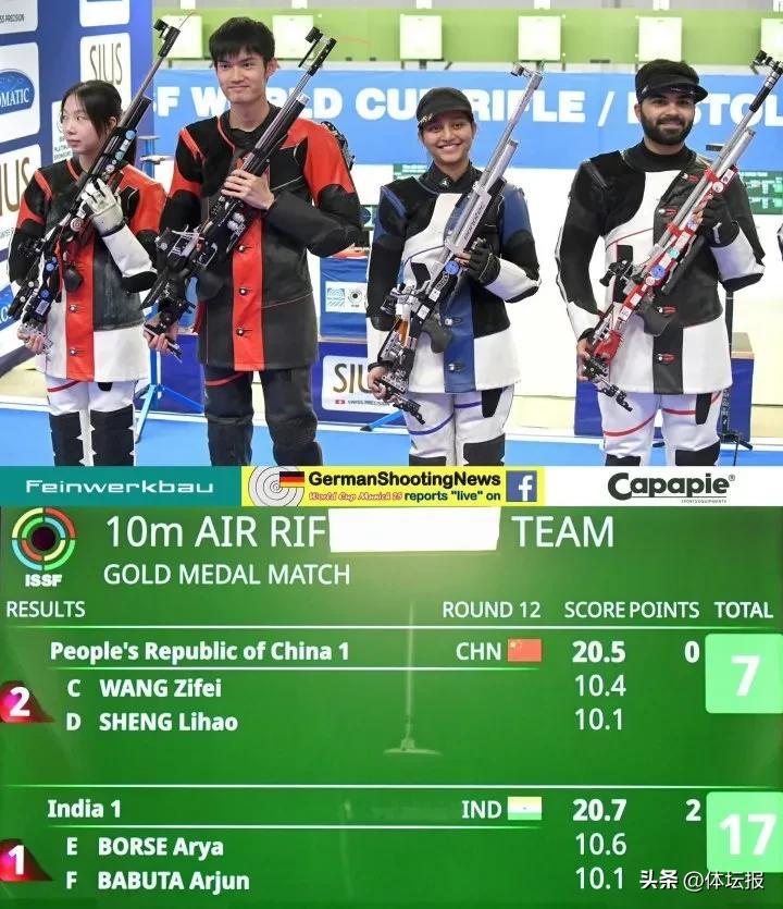 不過在金牌戰中,王子菲和盛李豪表現均有所起伏,以7:17不敵印度新組合阿里婭·博爾澤和阿爾瓊·伯布策。巴黎奧運會上獲得男子氣步槍第四名的伯布策在打了12發的金牌戰中平均成績達到10.58環。