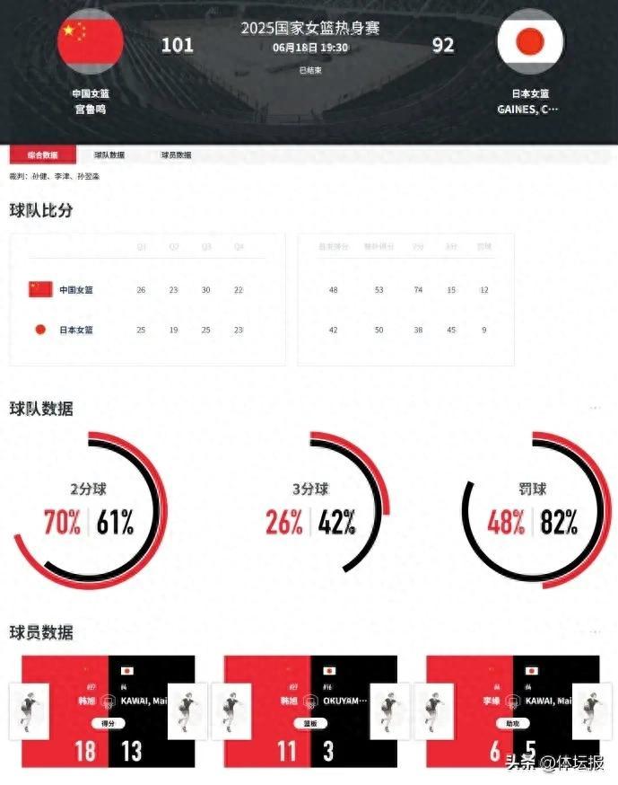 爲備戰亞洲盃,中國女籃開啓系列熱身賽,在與波黑女籃對決取得兩連勝後,中國女籃轉戰西安,6月18日對陣亞洲勁敵日本女籃,最終以101-92再次取得勝利。