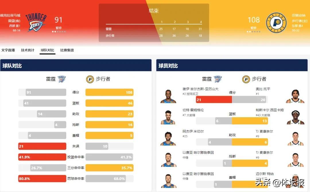 此役,客場作戰的雷霆更快進入狀態,以一波進攻小高潮打出順風開局。步行者也迅速作出反擊,內姆布哈德里突外投連得8分,幫助球隊實現反超;隨後,球隊更是火力全開,託平與哈利伯頓手感火熱,連續命中三分,打停雷霆。比賽進入第二節,步行者依然佔據更多主動權,哈利·伯頓妙傳西亞卡姆上演暴力隔扣,上半場結束,步行者64-42,將分差擴大至22分。第四節決戰,領先30分的步行者更是沒有壓力,108-91輕鬆取勝。