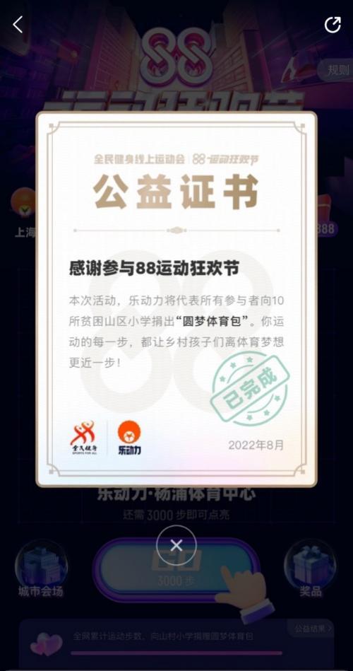 用戶還可以通過參與“88運動狂歡節”主會場核心活動“點亮城市”完成公益善舉。打開樂動力APP,選擇指定AI及走跑運動,參與並累計步數或AI運動次數,步數達標後可“點亮城市”,後續根據點亮城市的數量,領取相應獎勵和公益證書。活動結束後,樂動力將代表所有參與者,向10所貧困山區小學捐贈包含包排球、籃球、跳繩等常用體育器材的“圓夢體育包”