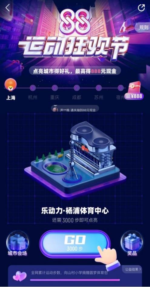 “點亮城市”得到了各地體育主管部門的大力支持。以上海站點爲例,作爲今年楊浦區全民健身系列活動的一部分,“88運動狂歡節”由上海市楊浦區體育總會和橙獅體育共同主辦,樂動力楊浦體育中心作爲承辦單位,樂動力作爲比賽平臺,從7月25日起開展的線上全民健身活動吸引了超過60萬名用戶參與、點亮上海城市站點。