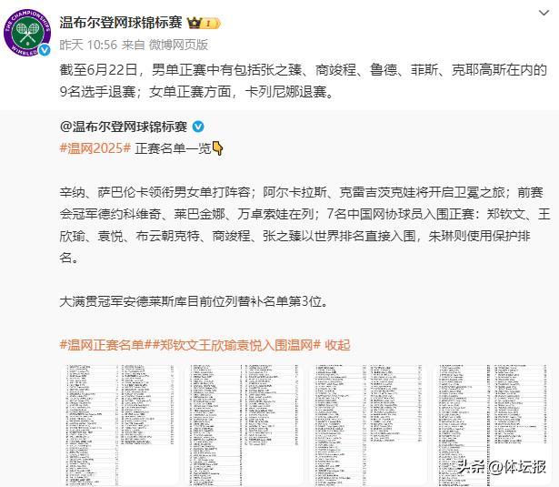 根據溫網官方昨天公佈的最新入圍名單顯示,共有5名中國球員入圍今年的溫網單打正賽。