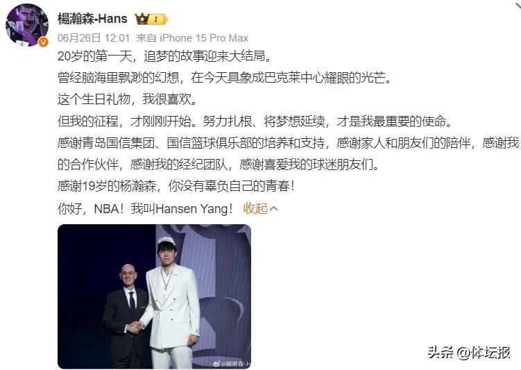 6月26日,2025NBA選秀大會上,波特蘭開拓者隊在首輪第16順位摘下楊瀚森,這位身高2.18米的中鋒也成爲中國第三位NBA首輪秀。此消息一出,中國籃球迷振奮不已,也激勵着懷揣夢想的中國球員。選秀的高光時刻固然令人激動,但真正的考驗在於日復一日地堅持和進步。正如姚明所言,選秀只是人生的一小部分,未來的路更需要踏實前行。而從楊瀚森的逐夢故事中,我們也能讀到更多信息。