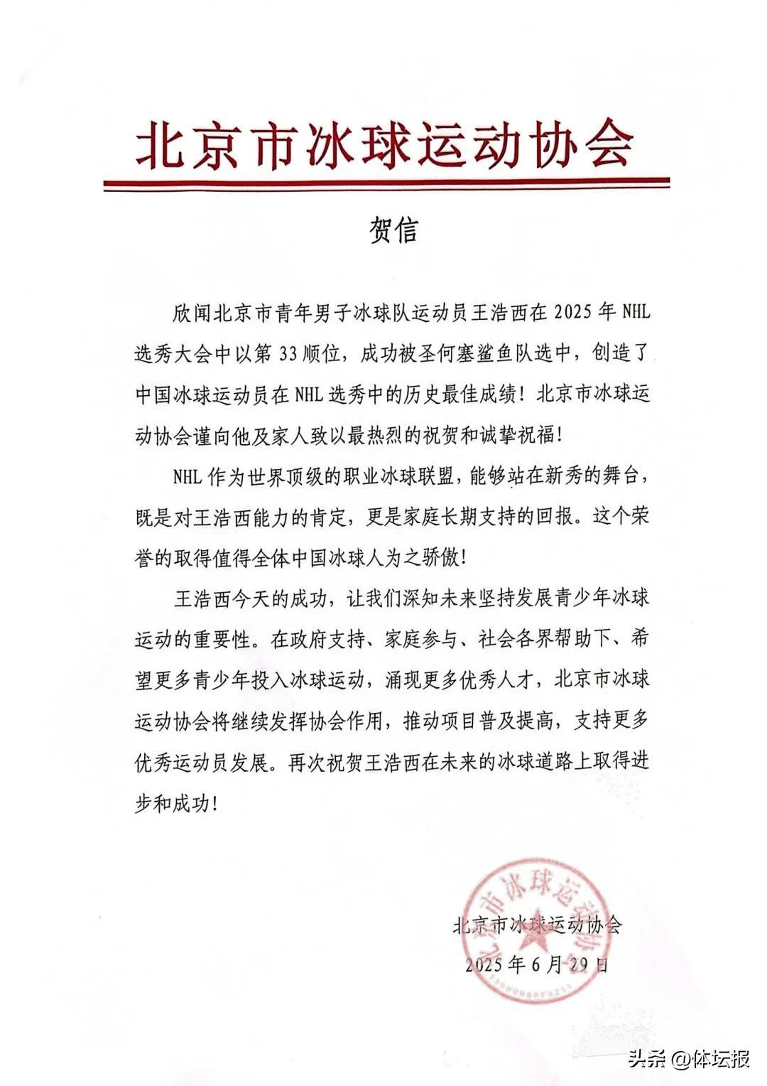 今天凌晨,北京市冰球運動協會發出賀信,賀信中寫道:“王浩西能夠站在NHL新秀的舞臺,既是對他能力的肯定,更是家庭長期支持的回報。這個榮譽的取得值得全體中國冰球人爲之驕傲!”