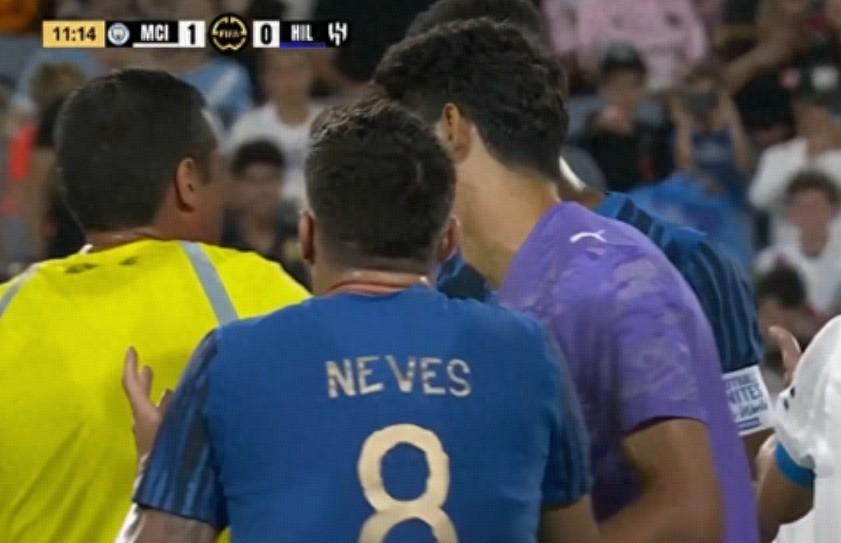 按理說,出現爭議情況,尤其是涉及到進球與否的時候,主裁都會從耳機裏聽到視頻裁判的提示,不過這一次,當值主裁態度非常堅決,他認爲進球有效,曼城屬於無意手球,所以沒有讓VAR未介入,即便利雅得新月球員長時間抗議,裁判仍很堅決,不斷強調努裏貼緊手臂,沒有犯規。