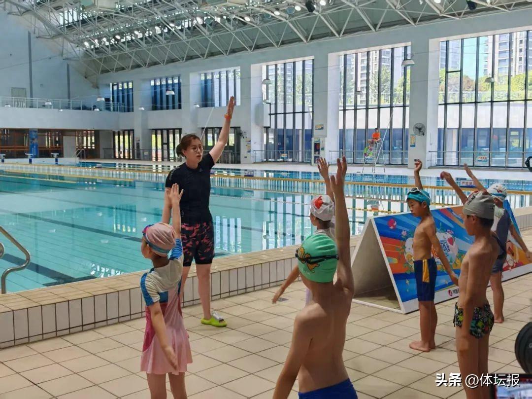 泳池邊,參與此次指導教學的小朋友們早已迫不及待,傅園慧也化身貼心教師,爲他們帶來一節蛙泳進階課。