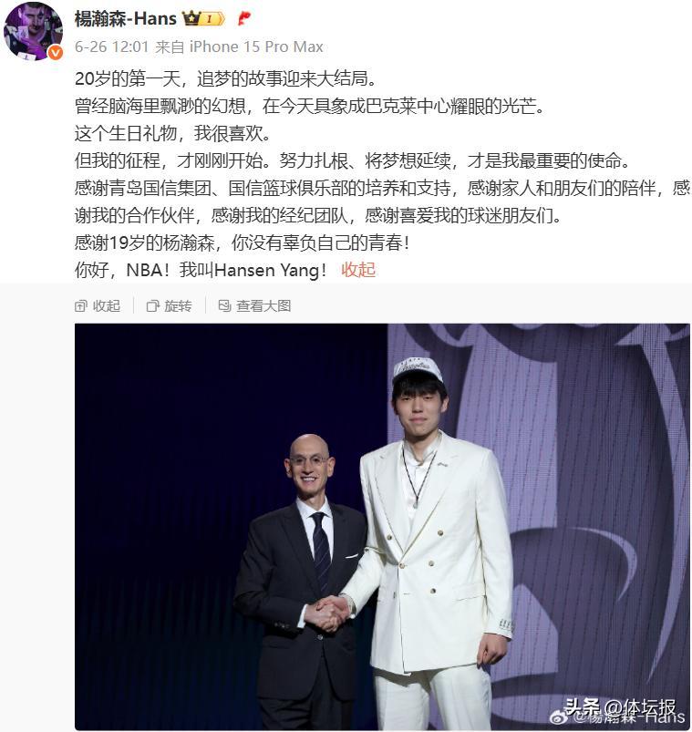 楊瀚森於2005年6月26日出生在山東省淄博市,選秀當天正好是他20歲的生日。