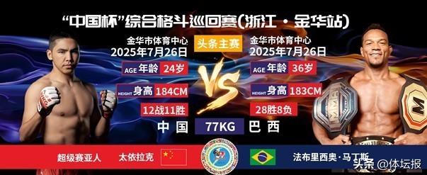 據悉,本次賽事由中國少數民族體育協會主辦,永康市鴻禧體育發展有限公司、廣州龍三格鬥傳媒有限公司聯合承辦,賽事將於2025年7月26日在金華市體育中心震撼開賽。賽事吸引了中、日、韓、美、俄等8個國家的30位頂尖拳手參賽,將通過全程直播呈現這場融合力量與技巧的格鬥盛宴。其中頭條主賽將由中國超級新星太依拉克對戰巴西傳奇選手法布里西奧,比賽極具看點。