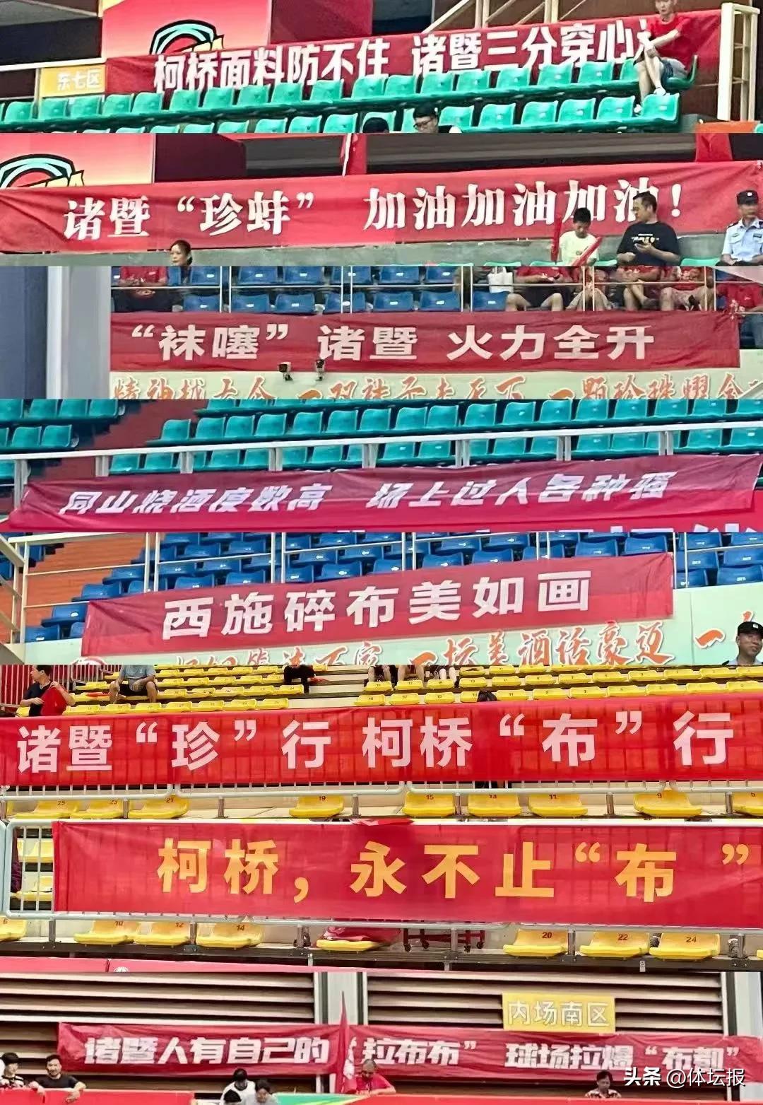 賽前,兩隊更是鉚足了勁,互放狠話。諸暨“珍”行,柯橋“布”行;諸暨人有自己的“拉布布”,賽場拉爆“布”都,這樣的諧音梗從城市大屏到賽場橫幅;雙方球迷也是穿上了各自隊伍的應援服 ,鑼鼓、橫幅,一個不落,大家都使勁爲各自球隊加油。