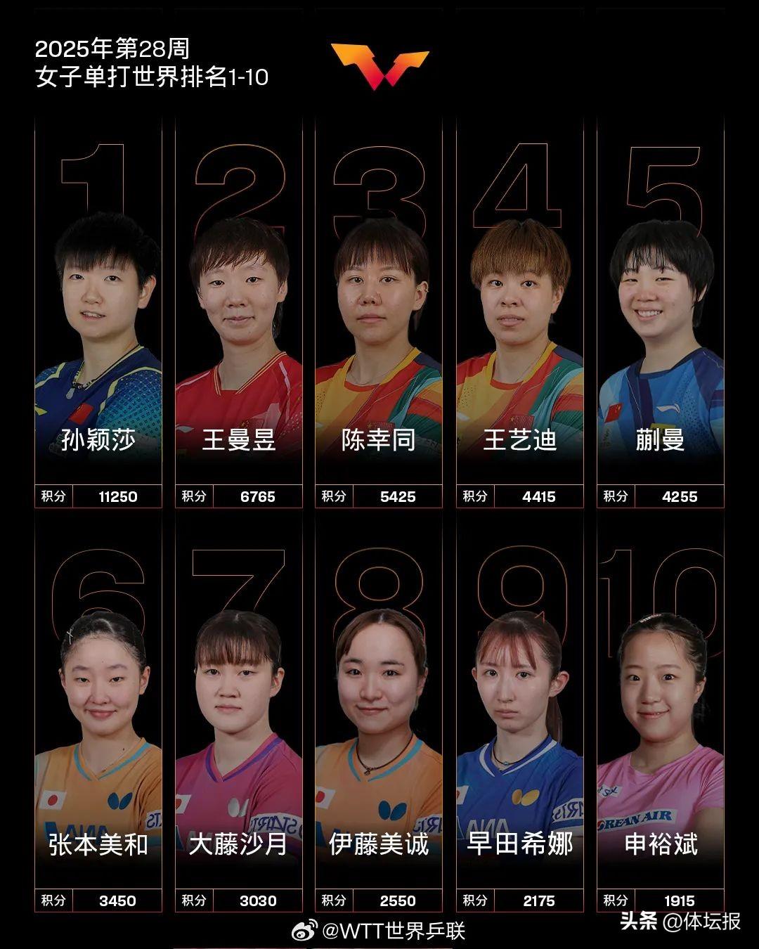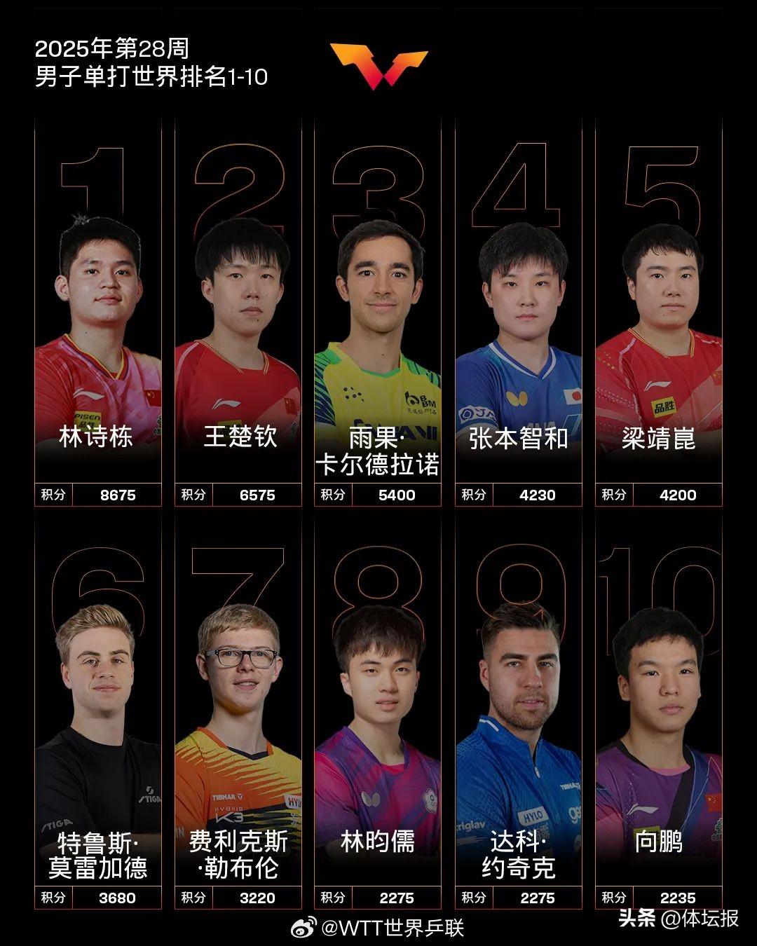 7月8日,WTT世界乒聯公佈國際乒聯2025年第28周世界排名。
