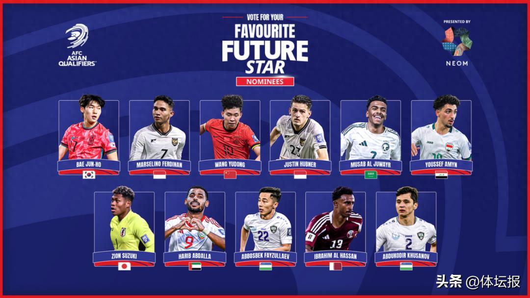 7月8日,亞足聯發起世預賽亞洲區未來新星投票。據亞足聯官網信息,在亞足聯亞洲預選賽(2026年世界盃亞洲區預選賽)第三輪結束後,亞足聯挑選出11名在各自國家/地區留下深刻印象的球員,邀請大家票選最愛的新星!其中,中國球員王鈺棟入選。