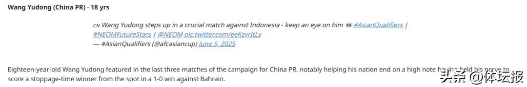 簡介則寫道:18歲的王鈺棟參與了中國國家隊在本次賽事的最後三場比賽,尤其在對陣巴林隊的比賽中,他頂住壓力,於傷停補時階段罰進制勝點球,助力球隊以1-0獲勝,爲國家隊的此次征程畫上了積極的句號。