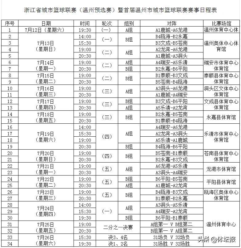 根據賽程安排,溫州賽區比賽將從7月12日開始至7月26日結束,期間將開展34場精彩對決,先是分組主客場循環賽,各組前兩名將在溫州體育中心爭奪代表溫州出戰“浙BA”的資格。