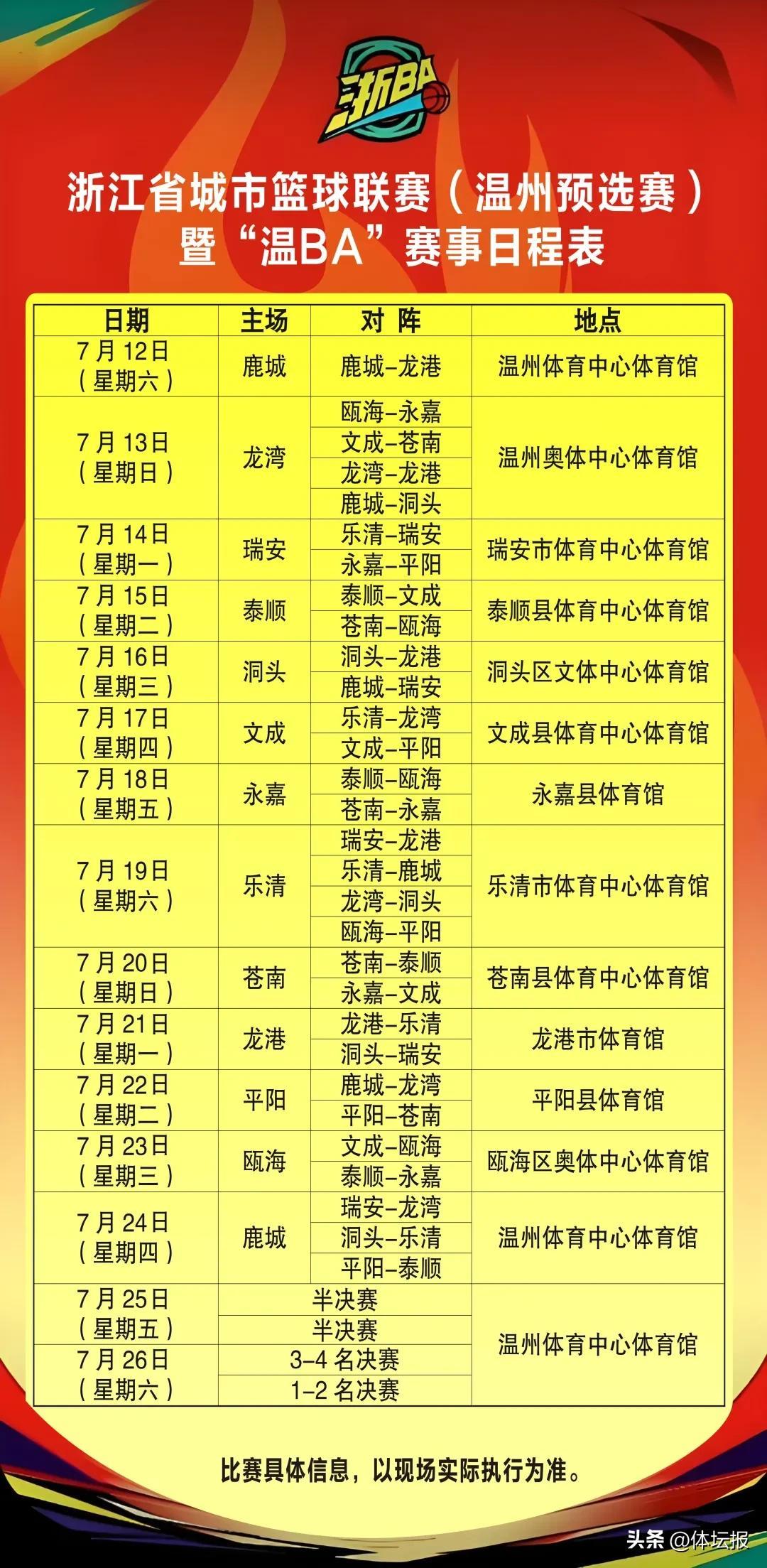 根據賽程安排,“溫BA”將從7月12日開始至7月26日結束,溫州賽區將上演34場精彩對決,先是分組主客場單循環賽,各組前兩名將爭奪代表溫州出戰“浙BA”的資格。