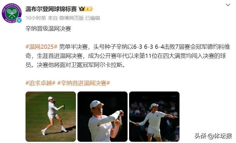 另外一場男單半決賽中,頭號種子辛納以6-3、6-3、6-4擊敗7屆賽會冠軍德約科維奇,生涯首進溫網決賽。