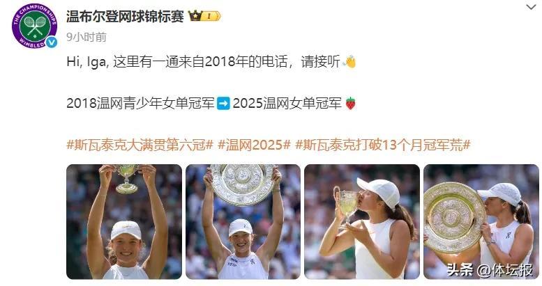 北京時間7月12日,波蘭名將斯瓦泰克在溫網女單決賽中用時不到一小時,以兩個6-0擊敗美國選手阿尼西莫娃,奪得個人第六個大滿貫冠軍頭銜,創溫網公開賽時代女單決賽最懸殊比分紀錄。