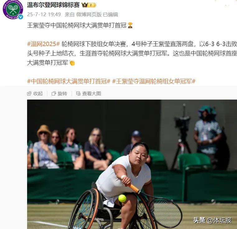 輪椅網球下肢組女單決賽,4號種子、中國姑娘王紫瑩直落兩盤,以6-3 6-3擊敗頭號種子上地結衣,生涯首奪輪椅網球大滿貫單打冠軍。這也是中國輪椅網球首座大滿貫單打冠軍。
