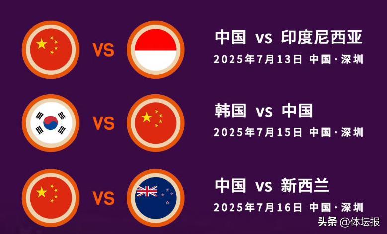 根據賽程,首個比賽日中國隊將在7月13日19:30對陣印度尼西亞隊,隨後在7月15日對陣韓國隊、7月16日對陣新西蘭隊。